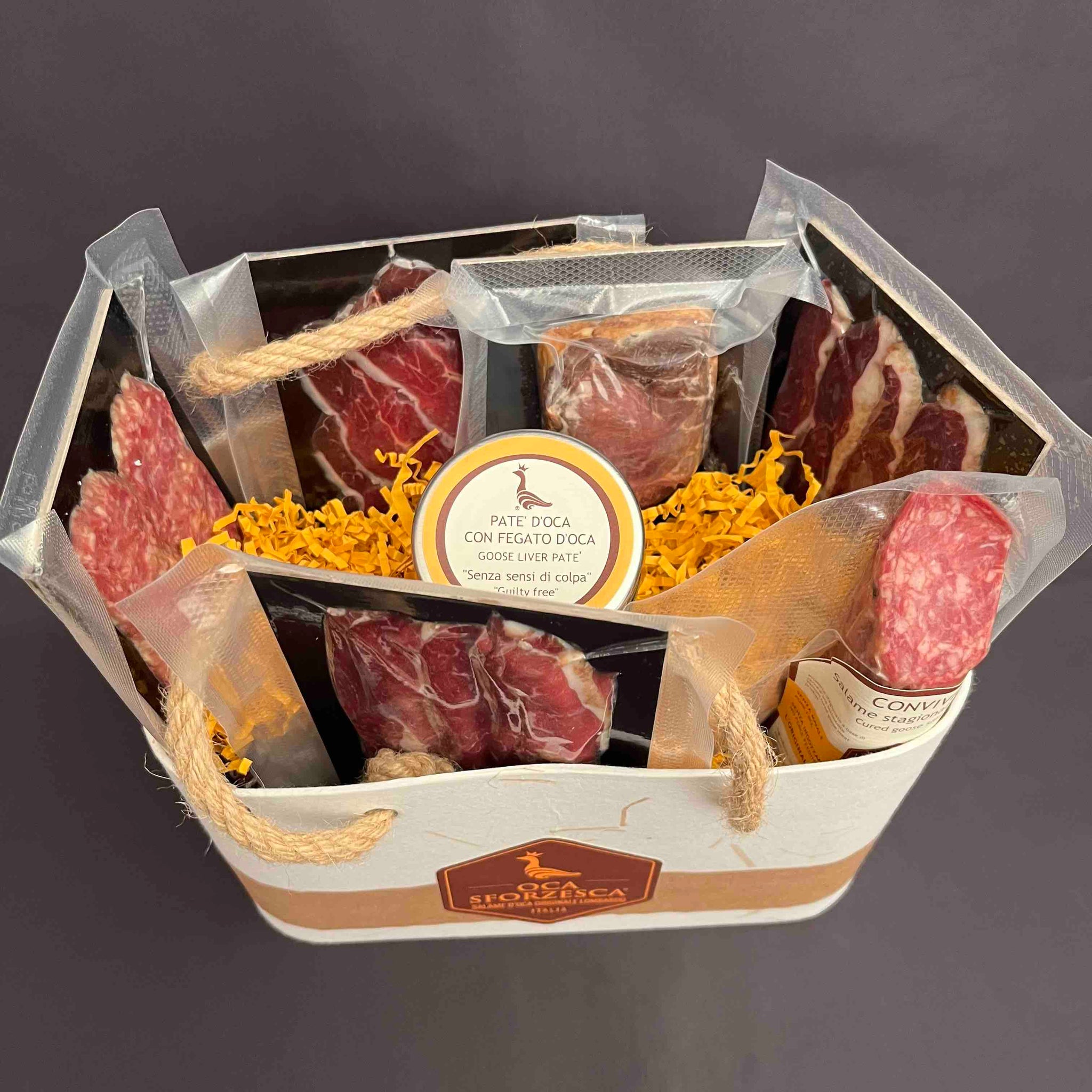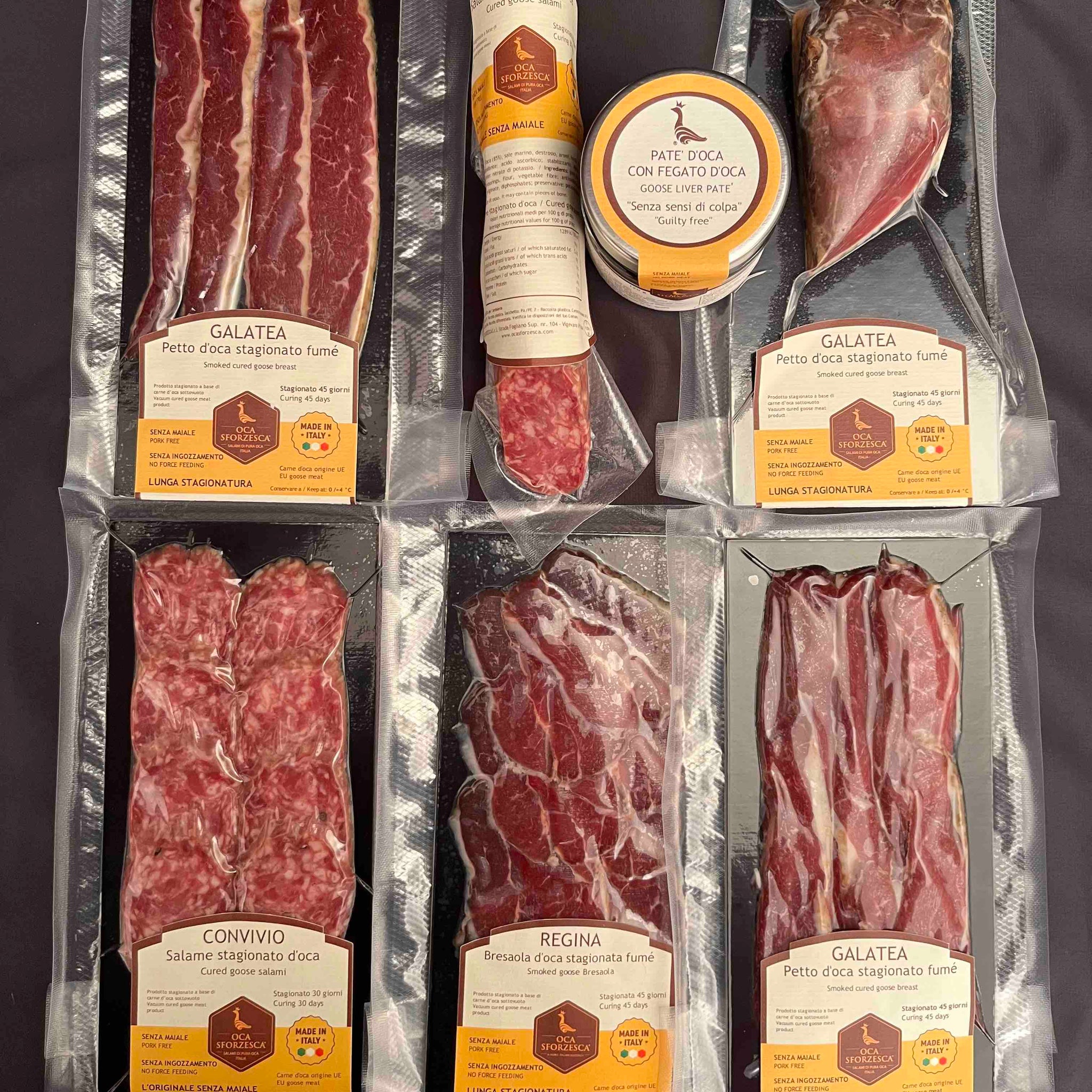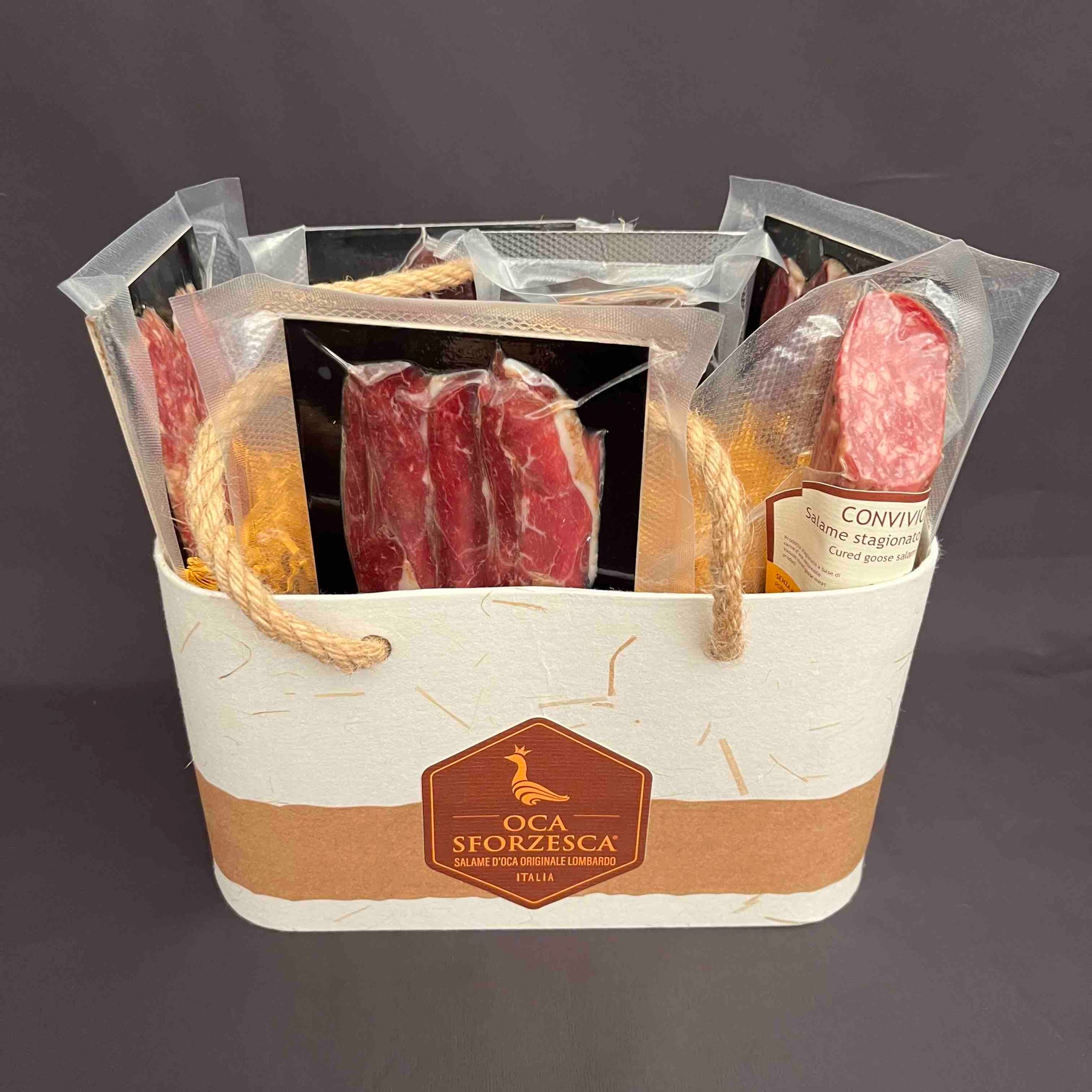 Questo cadeau è composto solo da prodotti d'oca stagionati o crudi, salumi d'Oca Originali (senza maiale) come da tradizione millenaria, dal Paté d'oca della linea "Senza sensi di colpa".
